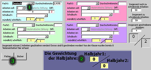 Wenn Sie im Fächerformular (öffnen Sie es mit dem Fächer-Button [3]) Ihre Fächer eingetragen und falsche Fächer gelöscht haben, aktualisieren Sie das Klassenformular und Sie können im Fächer-Feld aus Ihren Fächern wählen. Wenn Sie wollen, können Sie hier auch eintragen, wieviele Arbeiten Sie in diesem Schuljahr schreiben wollen und das Programm hilft Ihnen dann, den Überblick zu bewahren.