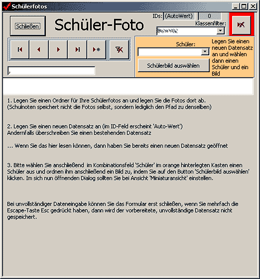 Dann öffnen Sie das Foto-Formular und stellen im Schüler-Kombinationsfeld des orangefarbenen Felds den Schüler ein, dem Sie ein Foto zuweisen wollen.