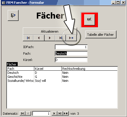 Schließen Sie das Formular und aktualisieren Sie anschließend das Klassenformular, indem Sie auf den "Aktualisieren"-Button klicken. Das Formular liest dann die Tabellen neu ein und Sie finden in den Drop-down-Listen Fach1, Fach2 etc. nun die von Ihnen eingegebenen Fächer zur Auswahl.