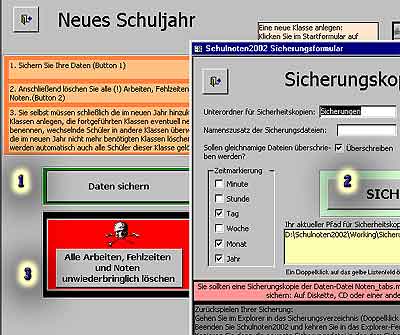 Dies Funktion ist nicht ungefährlich, denn alle Daten in den Tabellen Noten, Arbeiten und Fehlzeiten werden unwiederbringlich gelöscht! Deshalb wird der Löschen Button erst dann aktiviert, wenn Sie vorher das Datensicherungsformular aufgerufen haben (Sie müssen Ihre Daten dann nicht sichern, aber Sie sollten es tun!): Nach der Datensicherung und dem Löschen der alten Daten, müssen