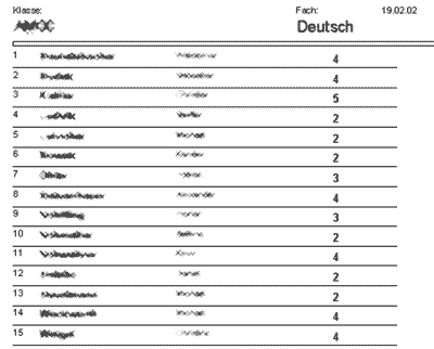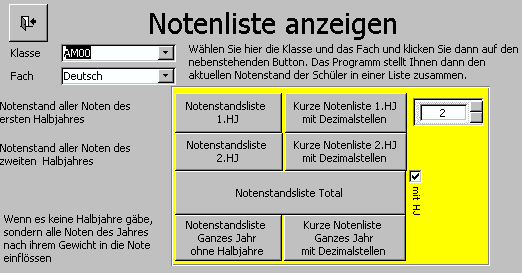 Sie haben jetzt die Auswahl zwischen verschiedenen Notenlisten. Beispiele: Den folgenden Bericht erhält man, wenn man auf "Notenstandsliste 1.HJ" klickt: