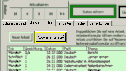 Verschaffen Sie sich einen Überblick über den aktuellen Notenstand aller Schüler in einer Klasse: Im Register "Klassenarbeiten" des Klassenformulars gibt es den Button "Notenstandsliste".