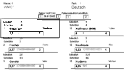 Dieser Bericht eignet sich besonders gut zur Weitergabe von Zeugnisnoten. Der aktuelle Notenstand der mündlichen und schriftlichen Noten sowie der Gesamtnotenstand wird berechnet und dann gerundet und ungerundet ausgegeben |